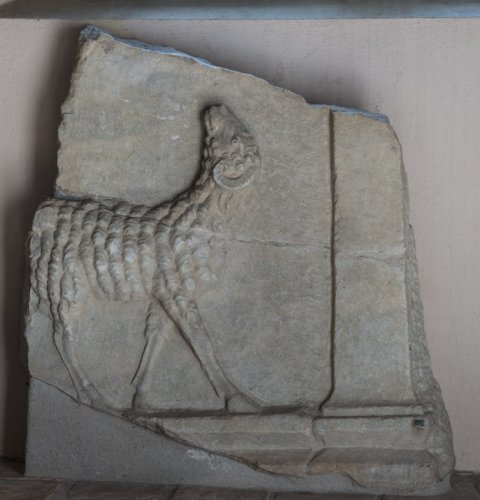 - Nach rechts gehender Widder mit nach oben zurückgedrehtem Kopf, rechts von ihm glatter Pilaster (Kreuz ?)