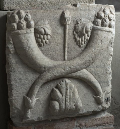 - Schmalseite eines Sarkophages: zwei gekreuzte Füllhörner mit Früchten und Weintrauben, unten Blattkelch, daraus aufragender Thyrsosstab.