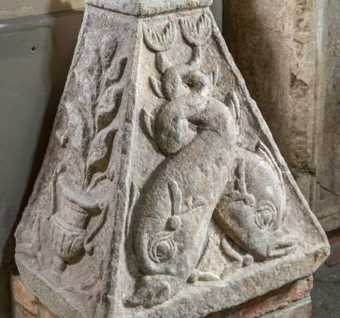 - Auf der Vorderseite zwei Delphine, auf den Nebenseiten Krater mit Pflanze. Oben vierseitiges Kapitell und Pinienzapfen.