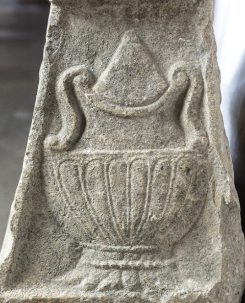 - Auf der Vorderseite zwei Delphine und Dreizack, auf den Nebenseiten Krater mit kegelförmigem Deckel. Oben Pinienzapfen.