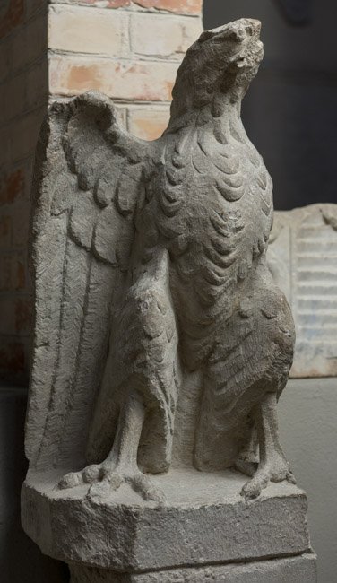 - auf eckiger Plinthe stehender Adler mit ausgebreiteten Flügeln