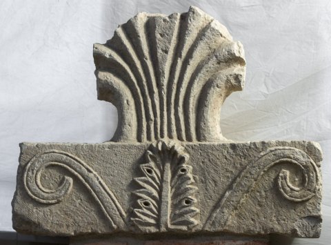 - Palmette auf rechteckigem Sockel mit Akanthusblatt zwischen zwei Voluten