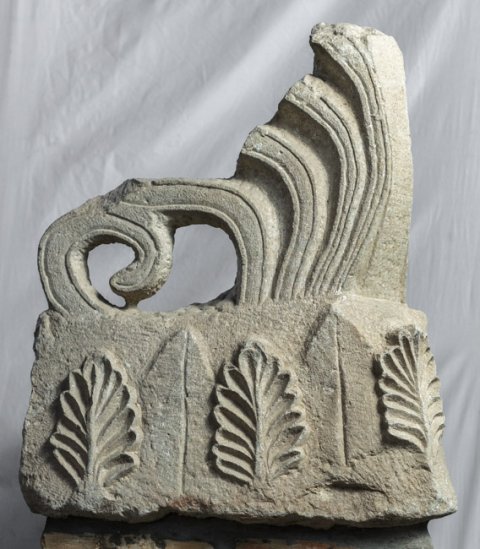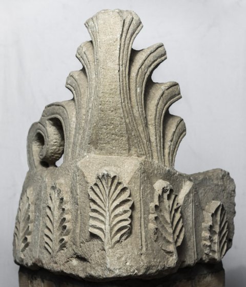 - Eckakroter, auf dem Sockel Reihe von Blättern, darüber große Palmette zwischen Voluten.