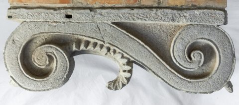 - Doppelvolute mit Akanthusblättern, darauf liegende flache Platte