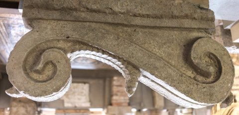 - Doppelvolute mit Akanthusblättern, darauf kubisches Auflager