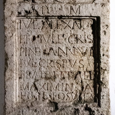 - D(is) M(anibus) // Iul(io) Alexandro / et Iuli(a)e Cris/pin(a)e ann(orum) VL / Iul(ius) Crispus / fratri et Ael(ia) / Maximina / fili(a)e posuit (!)