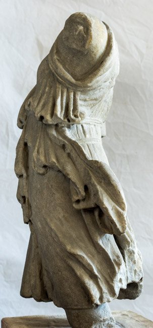 - Mythische Figur: bewegte weibliche Gestalt in kurzem Chiton mit gegürtetem Überschlag, linker Arm war erhoben. Artemis-Diana ? Auf der Rückseite unten rechts Zweige mit Blättern.
