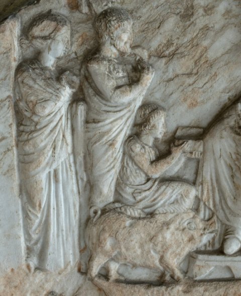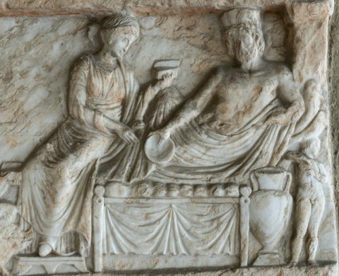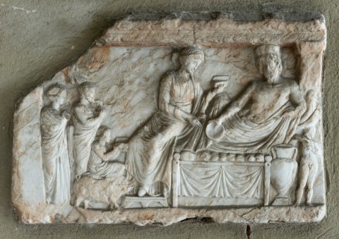 - Bankettszene (Totenmahl): auf einer Kline gelagerter bärtiger Heros mit Kalathos, in der Rechten Schale. Auf dem Fußende der Kline sitzende Frau in Ärmelchiton und Mantel, in der Linken Kästchen. Vor der Kline Tisch mit Speisen, daneben Amphore und nackter Knabe (Diener). Von links nähern sich drei Adoranten (bärtiger Mann im Mantel, eine Frau in Chiton und Mantel und ein Mädchen, das kniend ein offenes Kästchen hält) und ein Schwein. Seitlich Pilaster, die ein Dach tragen.