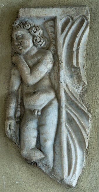 - Auf die gesenkte Fackel gelehnter Trauergenius, rechts Rahmenleiste und Reste der Riefeln.