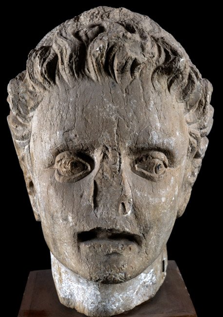 - Gesicht und Stirnhaar sekundär überarbeitet, Nase abgebr., Bruch durch den Hals
