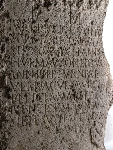 - D(is) M(anibus) / Iul(io) Tertio quondam / stratori consular(is) / stip(endiorum) XXV vixit ann(os) XL / et Iul(io) Mauro filio vixi(t) / ann(os) IIII et Furniae / vernacul(a)e Aurel(ia) / Felicla(!=Felicia) marito / pientissimo viva / sibi et suis faciendum / curavit / o(pto) s(it) t(ibi) t(erra) l(evis)