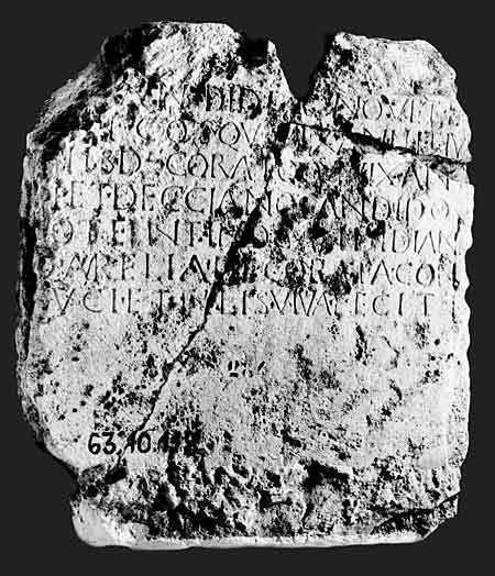 - [Iul(io) C]andidiano vet(erano) e[x] / b(ene)f(iciario) co(n)s(ularis) qu[i] vix(it) an(nos) LII et Iu/[l]iis Decorato q[ui] vixit an(nos) / [-]I et Decciano Candido / [P]otentino Candidian/o Aurelia Decorata con/[i]ugi et fili(i)s viva fecit