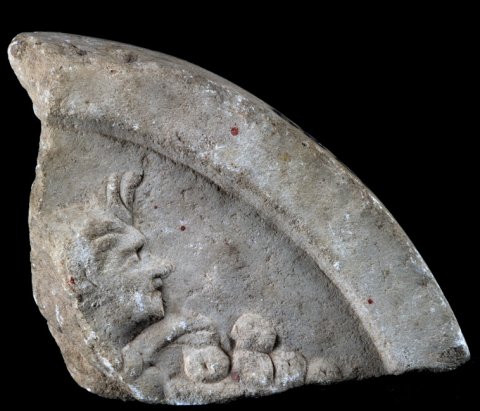 - Fragment einer runden oder halbrunden Platte. Erhalten ist der nach rechts zurückgedrehte Kopf eines Satyrs, der ein Gefäß mit Früchten trägt.