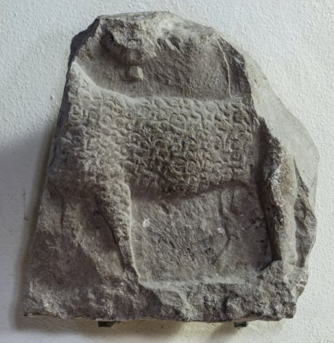 - nach links gehendes Schaf, darüber Reliefrest (Guter Hirte ?)