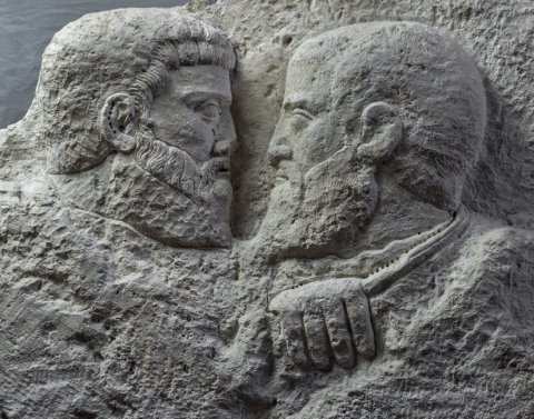 - Köpfe der Apostel Petrus (links) und Paulus, im Profil einander gegenübergestellt, der Rest des Reliefs bis auf eine Hand des Petrus nicht ausgeführt.