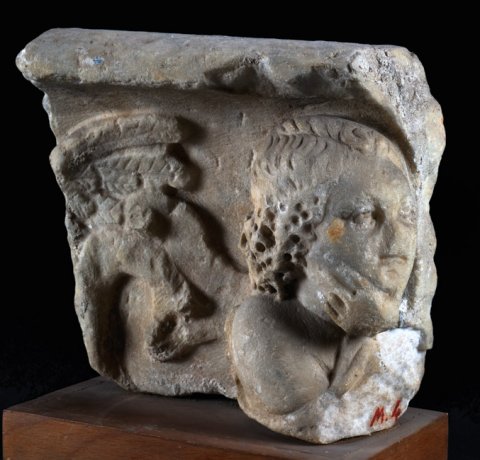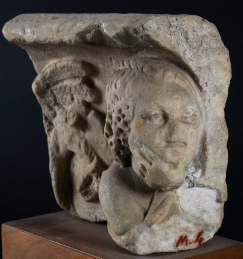 - Mythos: Amor und Psyche. Erhalten sind Kopf und rechte Schulter mit Schmetterlinsflügel der Psyche, an ihrem Kinn Hand des Amor. Links Flügel eines Eroten.