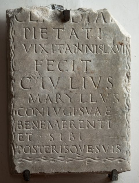 - ---] / Claudiae / Pietati / vixit annis LXVII / fecit / C(aius) Iulius / Maryllus / coniugi suae / bene merenti / et sibi / posterisque suis