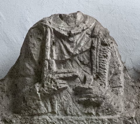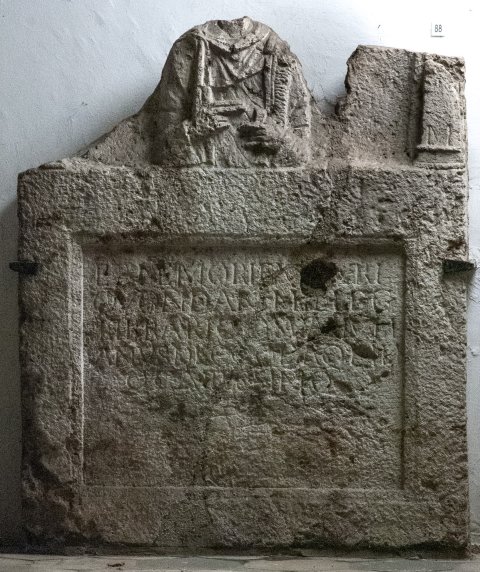 - zwischen Pilastern Brustbild eines Mannes in Ärmeltunica, Sagum mit Fransen, in der Linken Rolle (volumen).