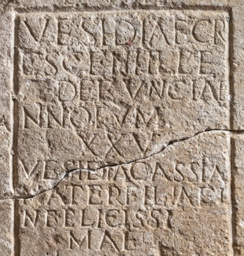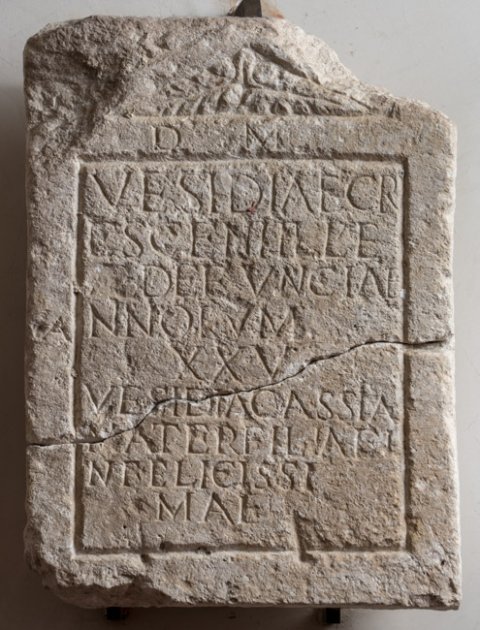 - D(is) M(anibus) / Vesidiae Cr/escentillae / defunciae(!) / annorum / XXV / Vesidia Cassia / mater filiae i/nfelicissi/mae