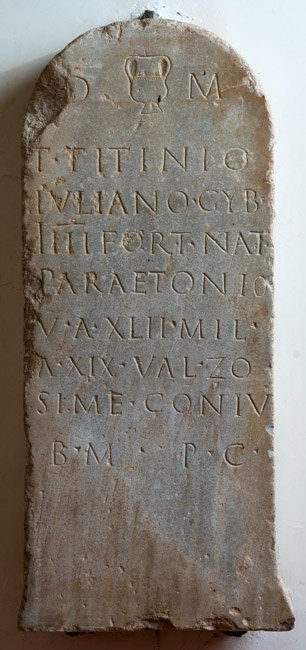 - D(is) M(anibus) / T(ito) Titinio / Iuliano gyb(ernatori)! / IIII(quadriere) Fort(una) nat(ione) / Paraetonio / v(ixit) a(nnos) XLII mil(itavit) / a(nnos) XIX Val(eria) Zo/sime coniu(gi) b(ene) m(erenti) p(onendum) c(uravit)