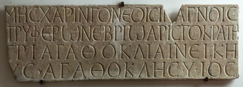 [---] Τρυφέρῳ Νεβρίῳ Ἀριστοκράτῃ / [μη]τρὶ Ἀγαθοκλίαι Νείκῃ / [---]υς ∙ Ἀγαθοκλῆς ∙ υ∙ἱ∙ός - Errichter