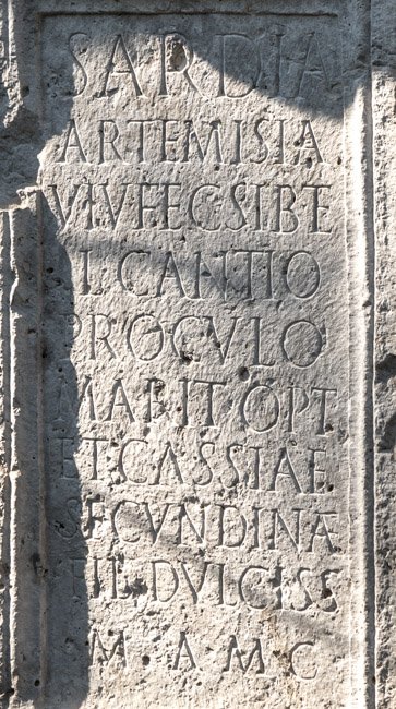 - Sardia / Artemisia / viv(a) fec(it) sib(i) et / L(ucio) Cantio / Proculo / marit(o) opt(imo) / et Cassiae / Secundinae fil(iae) dulciss(imae) / m() a() m() c()