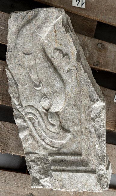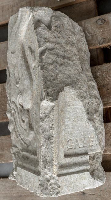 - früher ganz erhalten, heute oben u. rechts abgebr., Inschrift fast völlig abgeschlagen, Sockel u. Bekrönung fehlen