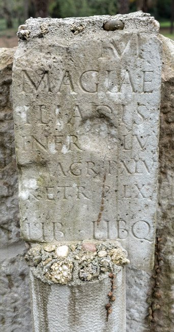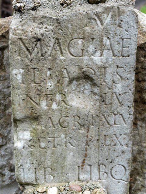 - [L(ocus)] m(onumenti) / Magiae / Iliadis / in fr(onte) [p(edes)] LV / in ag(ro) p(edes) XLV / retr(o) p(edes) LX / lib(ertis) lib(ertabus)q(ue)