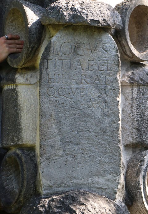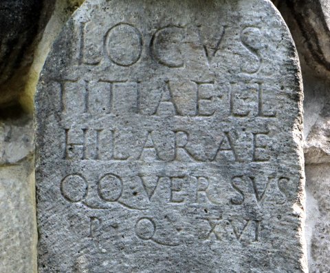 - Locus / Titiae L(uci) l(ibertae) / Hilarae / q(uo)q(uo)versus / p(edes) q(uoquoversus) XVI