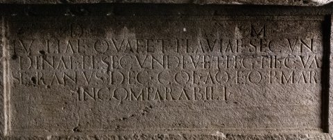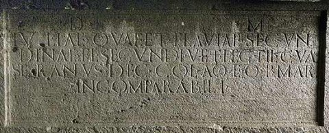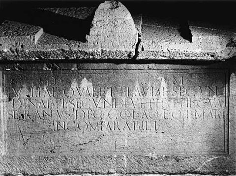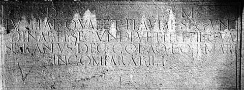 - D(is) M(anibus) / Iuliae quae et Flaviae Secun/dinae Fl(avii) Secundi vet(erani) leg(ionis) fil(iae) C(aius) Val(erius) / Seranus dec(urio) col(oniae) Aq(uincensium) eq(uo) p(ublico) matri / incomparabili