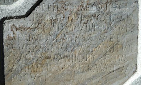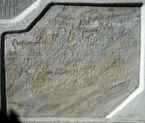 - [Caes]iae(?) Benignae coniugi / [d]ulcissim(a)e qu(a)e vi{c}xit an/nis XXXVII m(ensibus) VIIII d(iebus) XV et / Caesiae Donatae quae et / Severa filiae quae vixit vir/go ann(is) XV m(ensibus) III d(iebus) II Caesius / Carinianus contra votum / posuit