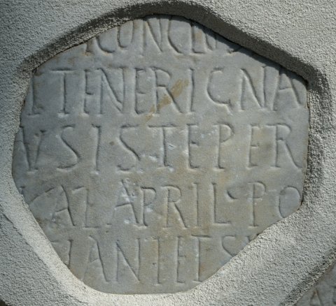 - ---] / [---] coni(ugi) [---] / [---]I concluserat [---] / [---] iteneri(!) Gnat[---] / [---]m siste per[---] / [---] Kal(endas) April(es) po[st cons(ulatum) Cons]/[tan]tiani et Sy[mmachi vv(irorum) cc(larissimorum)]