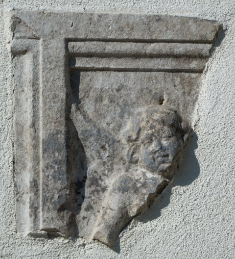 - Linke obere Ecke eines gerahmten Bildfeldes mit Kopf und rechter Schulter eines Genius (Erot). Links Ansatz einer gerahmten Schrifttafel.