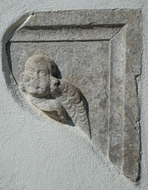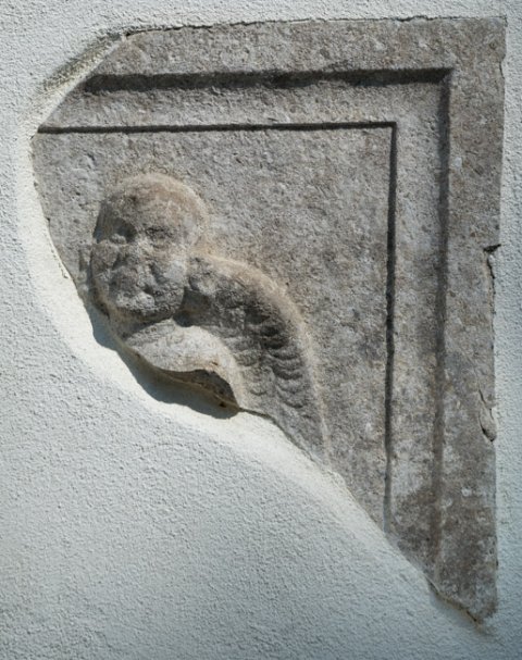 - Gerahmtes Feld, darin Kopf und linke Schulter eines Genius (Erot). Seitenfeld einer links anschließenden Schrifttafel.