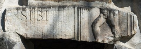 - Gerahmte Schrifttafel, rechts Bildfeld mit nacktem Genius (Erot ), der die Tafel hält.