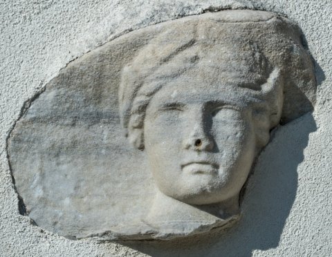 - Akroter eines Sarkophagdeckels mit idealtypischem Frauenkopf mit Diadem aus zwei Ähren. Personifikation einer Jahrezeit (Sommer).