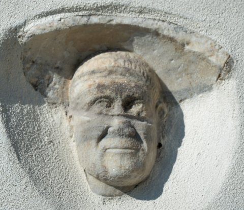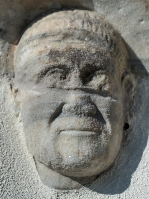 - Akroter eines Sarkophagdeckels mit Porträtkopf eines älteren Mannes mit kurzem Haar und Bart.