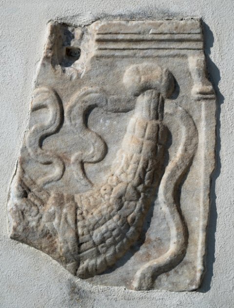 - zwischen Pilastern hängende Girlande mit Tänien, oben profilierter Rahmen