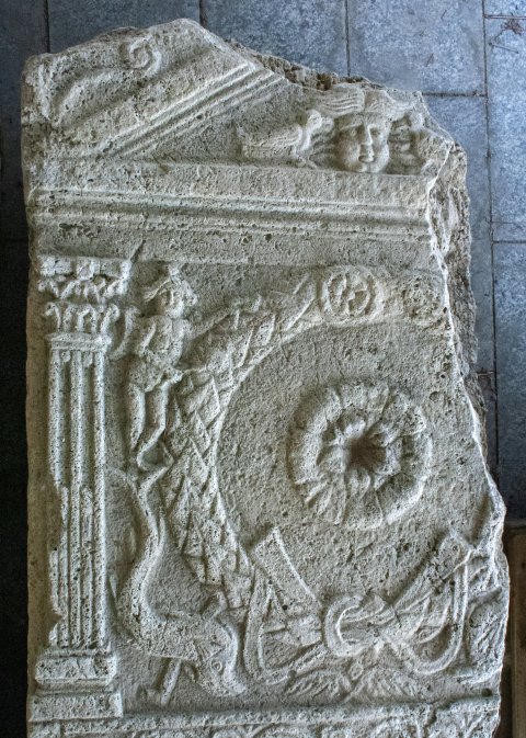 Im Hauptbild Kranz, Genius: zwischen Pilastern Lorbeerkranz mit Clipeus und Tänien, innen Rosette, oben Genien, unten Delphine. Auf dem Rahmen des Schriftfeldes Ranke. - Inschrift