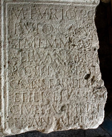 - M(arco) Furio Po[l(lia)] / Rufo Cana[b(--)?] / et Memmiae / Servand(a)e co[n]/iugi eius Stati[us] / Constans frat[er] / et her(es) eius f(aciendum) c(uravit) / cives Agrip(p)in[en(ses)] / Transalpini [---]