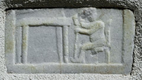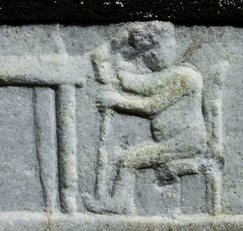 - Relieffeld mit glatter Rahmenleiste, darin an einem hohen Tisch sitzender Mann, der ein stabartiges Objekt hält, das er mit der Rechten bearbeitet (?).