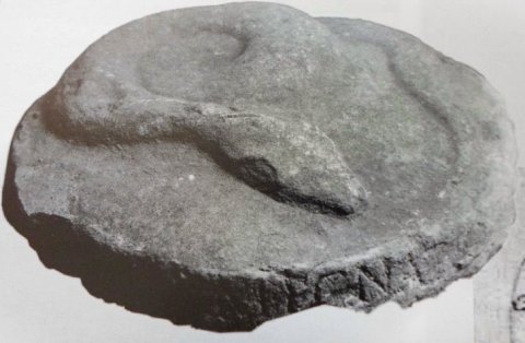 - runder Deckel, darauf Schlange, auf dem Deckelrand Inschrift