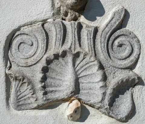- Mittelakroter: Palmette mit seitlichen Voluten, darunter drei Blätter.