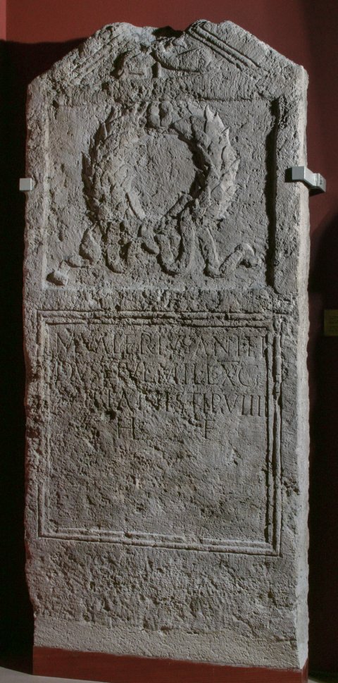 - M(arcus) Valerius Ani(ensi) Fi/dus F(oro) Iul(iensium) mil(es) l(egionis) X g(eminae) / (centuria) Vibiani stip(endiorum) VIIII / h(eres) f(ecit)