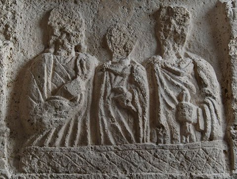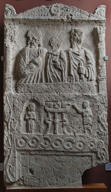 Im Hauptbild Familie: zwischen Säulen Halbfiguren eines Ehepaares mit Kind. Links Frau: Tunica, Mantel. In der Mitte Knabe: Sagum, Scheibenfibel, in der Linken Vogel. Rechts Mann: bärtig, Sagum, Scheibenfibel, in der Linken Rolle (volumen). Vor den Personen Brüstungsgitter.