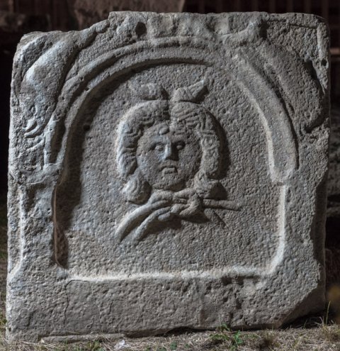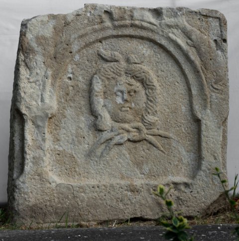 - Profilierter Bogen auf Pilastern, im Bogenfeld Gorgoneion, in den Eckzwickeln Delphin.