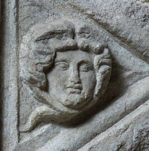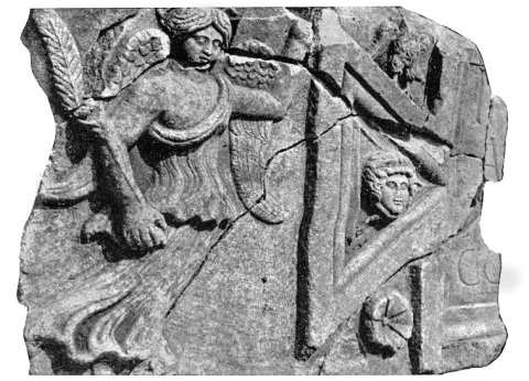 - tabula ansata mit profiliertem Rahmen, gehalten von Victoria. In der ansa Gorgoneion, im Zwickel oberhalb Adler, unterhalb Rosette.