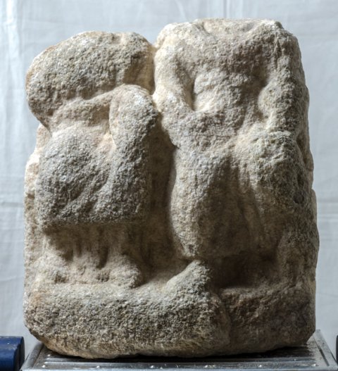 - Mythische Figuren: Pluto (Hades) und Proserpina (Persephone) auf Thron mit Rückenlehne. Neben dem linken Bein des Pluto hockender Cerberus.