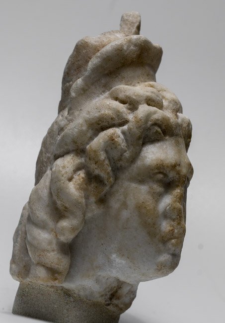 - Mythische Figur: Genius mit langen Locken, Diadem und Mauerkrone (?).