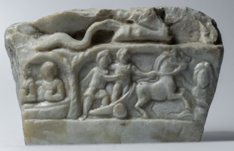 - Mythos: oben Rest der Stiertötung (Tauroktonie), darunter zwei Bildfelder. Links Gelage von Mithras und Sol, rechts besteigt Mithras den Wagen des Sol, vor den Pferden Okeanos.